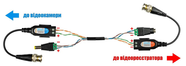 Для подключения камер SEVEN к видеорегистратору в комплекте предусмотрен кабель витая пара из расчета 20 м на каждую камеру, а также комплекты разъемов питания и специальных приемопередатчиков. Для удобства пользователь может самостоятельно определять длину каждого кабеля для подключения видеокамеры, исходя из особенностей его объекта. На кабеле со стороны видеокамеры монтируется приемопередатчик и разъем питания "папа", а со стороны видеорегистратора - приемопередатчик и разъем питания "мама". С помощью такого кабеля к видеокамере подключается BNC разъем приемопередатчика для передачи видео и коннектор питания "папа" для подачи на камеру напряжения 12В. Второй конец кабеля подключается разъемом BNC к видеорегистратору и разъемом питания "мама" к блоку питания. Достаточно просто подсоединить камеру к питанию и видеорегистратору, после чего он обнаружит камеру и покажет с нее изображение.